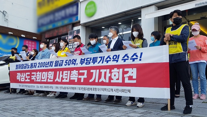 1일 민주노총을 포함한 대구지역 63개 시민단체는 곽 의원의 지역구 사무실 앞에서 기자회견을 열고 의원직을 내려놓을 것을 요구했다.