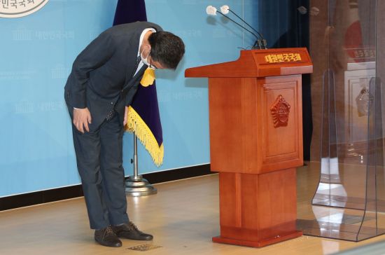 곽상도 무소속 의원이 아들의 '화천대유 퇴직금 50억원' 논란과 관련 2일 오전 서울 여의도 국회 소통관에서 국회의원직을 사퇴 발표에 앞서 인사하고 있다. 2021.10.2 [이미지출처=연합뉴스] |