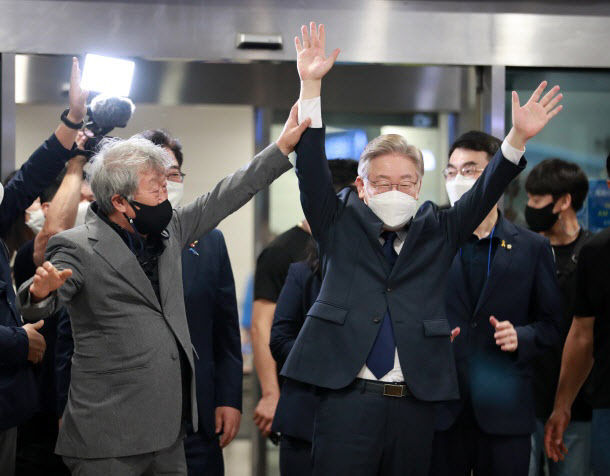 2일 오후 부산항국제전시컨벤션센터(BPEX)에서 열린 더불어민주당 대선 후보 선출을 위한 부산·울산·경남 순회 경선에서 득표율 55.34%로 1위에 오른 이재명 후보가 두 손을 번쩍 들며 지지자들에게 인사하고 있다. 왼쪽은 영화배우 명계남. (사진=연합뉴스) |