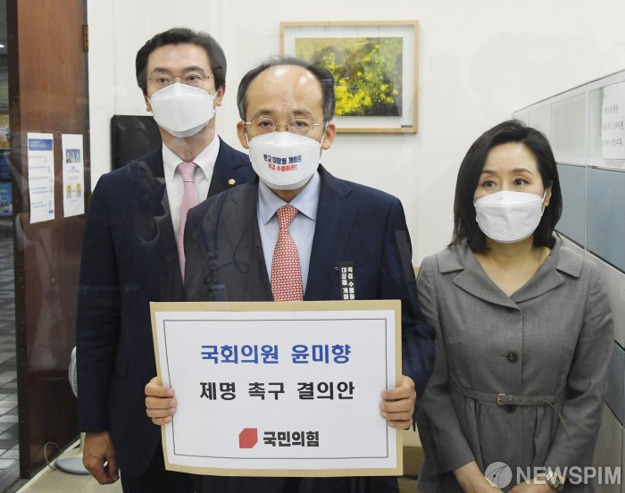 [서울=뉴스핌] 최상수 기자 = 국민의힘 추경호(가운데) 원내수석부대표와 전주혜(오른쪽), 강민국 의원이 6일 국회 의안과에 윤미향 국회의원 제명촉구 결의안을 제출하고 있다. 2021.10.06 kilroy023@newspim.com |