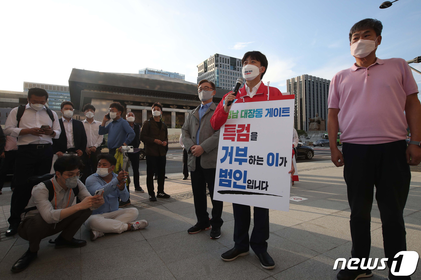 (서울=뉴스1) 국회사진취재단 = 이준석 국민의힘 대표가 6일 ‘대장동 의혹 진상 규명을 위한 특검 도입을 촉구하는 도보 투쟁’을 진행하며 서울 광화문 일대에서 발언하고 있다. 2021.10.6/뉴스1