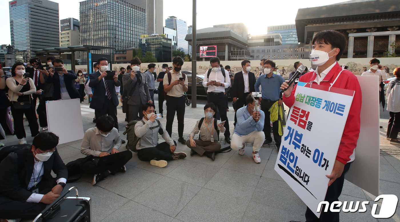 (서울=뉴스1) 국회사진취재단 = 이준석 국민의힘 대표가 6일 ‘대장동 의혹 진상 규명을 위한 특검 도입을 촉구하는 도보 투쟁’을 진행하며 서울 광화문 일대에서 발언하고 있다. 2021.10.6/뉴스1