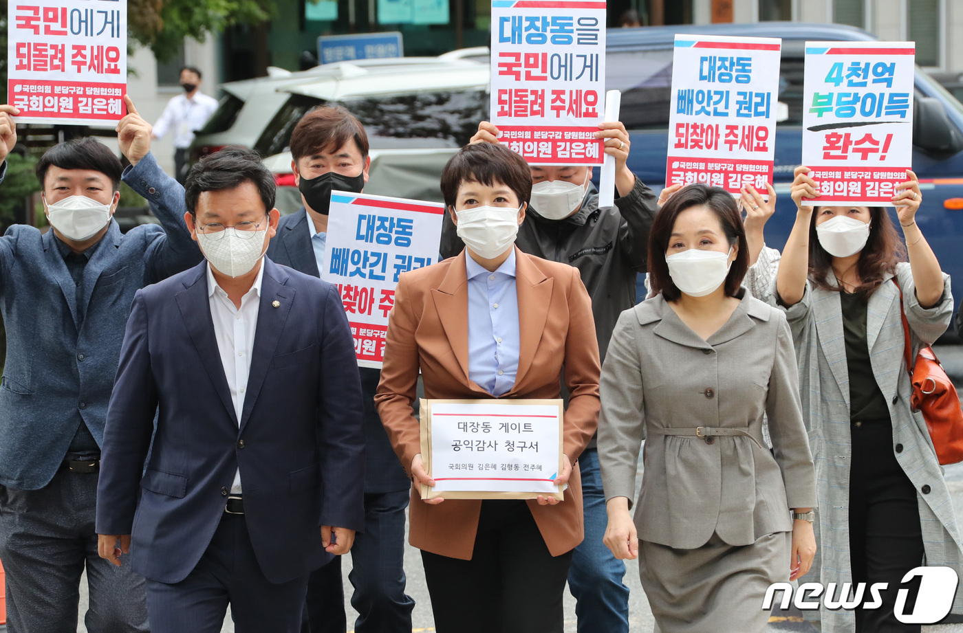 국민의힘 대장동 태스크포스 소속 의원들이 6일 경기도 성남시 대장동 주민들과 함께 감사원에 '대장동 개발특혜 의혹'에 대한 공익감사 청구서를 제출하고 있다. 앞줄 왼쪽부터 국민의힘 김형동, 김은혜, 전주혜 의원(김은혜 국민의힘 의원실 제공)© 뉴스1 |