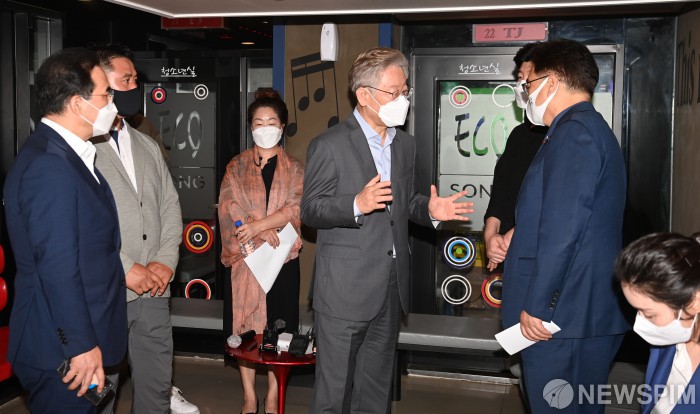 [서울=뉴스핌] 국회사진취재단 = 더불어민주당 대선주자인 이재명 경기도지사가 7일 오전 서울 종로구의 한 코인노래방에서 열린 '코로나19 위기 업종 자영업자 현장 간담회'에서 참석 자영업자들과 대화를 나누고 있다. 2021.10.07 photo@newspim.com