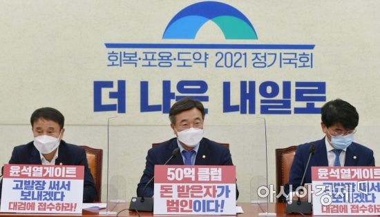 [아시아경제 전진영 기자] 윤호중 더불어민주당 원내대표가 박수영 국민의힘 의원이 공개한 화천대유자산운용 ‘50억 클럽’ 의혹에 대해 “하나같이 박근혜 정부의, 박근혜 전 대통령에 의한 박 전 대통령을 위한 검사 출신이 대부분”이라고 밝혔다.