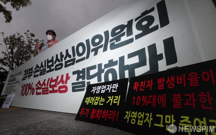 [서울=뉴스핌] 김학선 기자 = 8일 오전 서울 종로구 정부서울청사 앞에서 참여연대 및 한국자영업자협의회 등 시민단체들이 코로나19 방역지침 완화와 자영업자 100% 손실보상을 촉구하며 기자회견을 하고 있다. 2021.10.08 yooksa@newspim.com