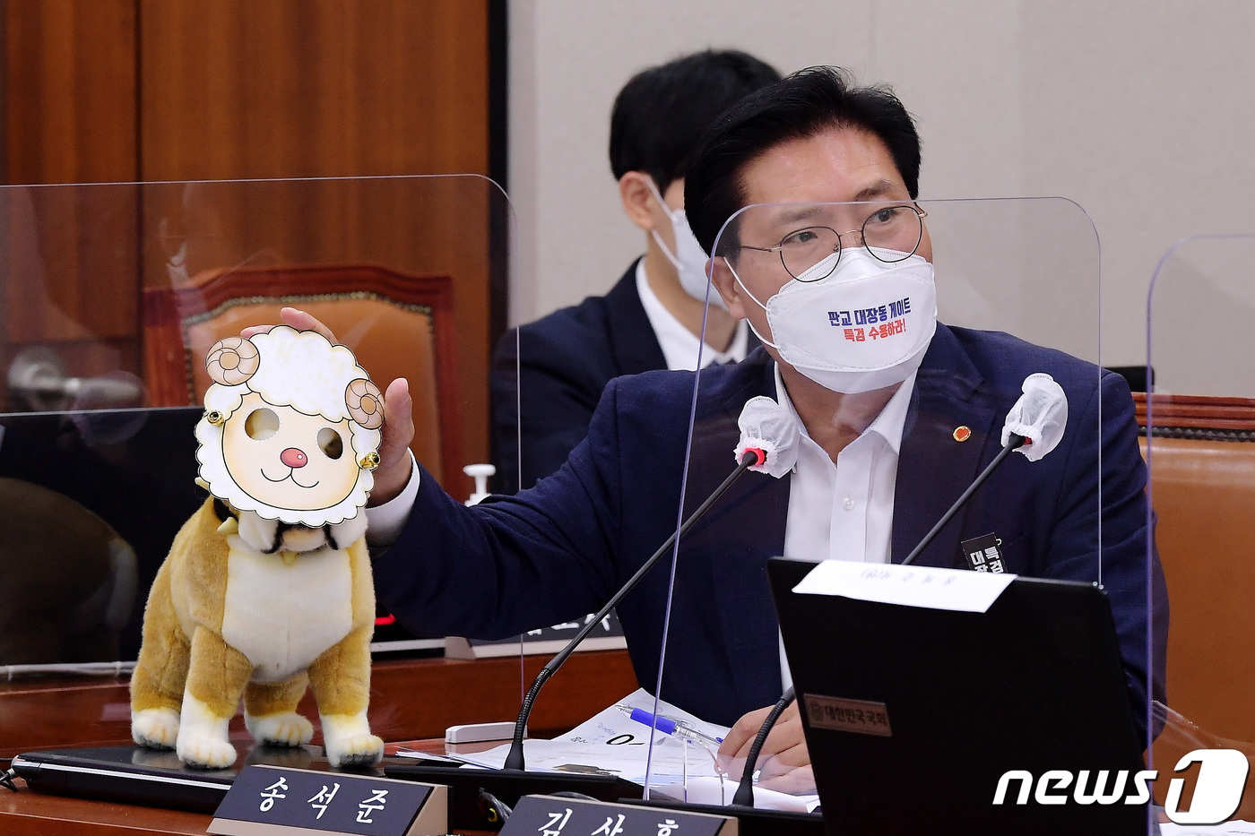 8일 오전 서울 여의도 국회에서 열린 국토교통위원회의 한국도로공사, 한국교통안전공단, 한국도로공사서비스(주) 등에 대한 국정감사에서 송석준 의원이 김진숙 한국도로공사 사장에게 '대장동 의혹'과 관련해 양의 머리를 쓴 강아지(양두구육:羊頭狗肉) 인형을 들고 질의하고 있다. 2021.10.8/뉴스1 © News1 이동해 기자 |
