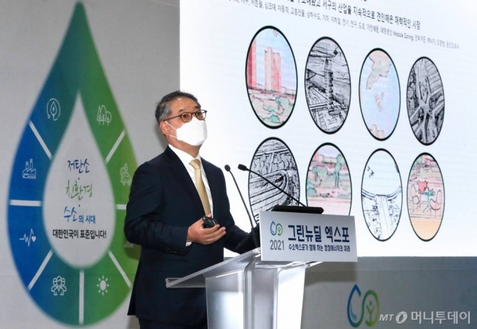 김도년 성균관대학교 교수가 8일 경기 고양시 킨텍스에서 열린 '2021 그린뉴딜 엑스포' 콘퍼런스에서 '기후변화 대응과 수소도시'를 주제로 발표를 하고 있다. 올해 3회째를 맞는 국회 수소경제포럼 주최 머니투데이 주관 '2021 그린뉴딜 엑스포'는 6~8일까지 고양 킨텍스에서 진행되며 수소산업과 전기차산업, 신재생에너지, 저탄소 친환경 등 그린뉴딜을 망라하는 대표 기업들이 대거 참가한다. /사진=김휘선 기자 hwijpg@ |