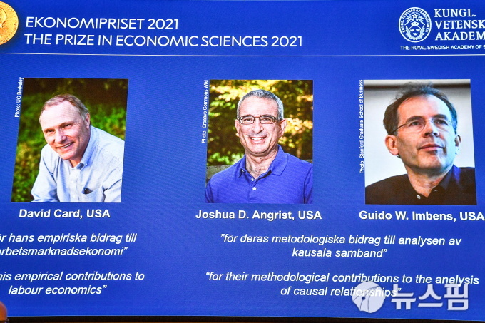 11일(현지시간) 로이터통신 등에 따르면 이날 스웨덴 왕립과학원 노벨위원회는 2021년도 노벨 경제학상에 데이비드 카드 캘리포니아주립대(버클리) 교수, 죠슈아 앵그리스트 매사추세츠공과대학교(MIT) 교수, 구이도 임번스 스탠포드대 교수를 공동 수상자로 발표했다.