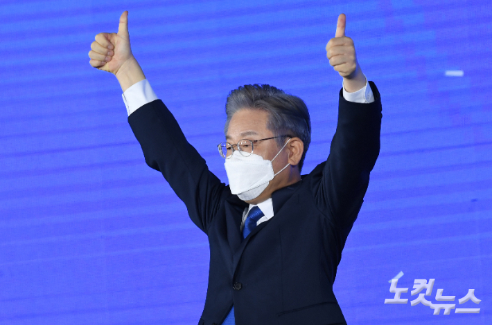 더불어민주당 제20대 대통령 후보에 선출된 이재명 경기도지사가 10일 오후 서울 송파구 올림픽공원 SK올림픽핸드볼경기장에서 열린 서울 합동연설회에서 두 손을 들어 인사하고 있다. 박종민 기자