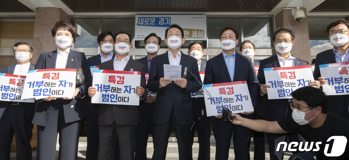 (수원=뉴스1) 국회사진취재단 = 국민의힘 김도읍 정책위의장을 비롯한 국회 정무·행안·국토위원회 소속 의원들이 13일 오전 2021년 국정감사에서 경기도와 성남시의 자료제출 비협조에 대한 항의로 경기도 수원시 팔달구 경기도청을 방문한 후 결과를 발표하고 있다. 2021.10.13/뉴스1