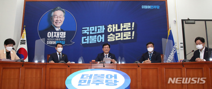[서울=뉴시스] 최진석 기자 = 송영길(왼쪽 세번째) 더불어민주당 대표가 13일 국회에서 열린 최고위원회의에서 발언하고 있다. (공동취재사진) 2021.10.13. photo@newsis.com |