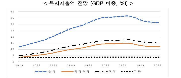 2019년 복지정책을 전제로 인구구조 변동에 따른 복지급여액을 추계한 결과 급여지출 총액은 2019년 GDP의 12.1%에서 2080년쯤 최대 36.5%까지 증가하는 것으로 전망됐다. 보고서는 현행의 조세제도와 사회보험료 수준을 유지할 경우 장기적으로 재정불균형이 예상되며, 재정불균형을 해소하기 위해서는 조세 및 사회보험료 부담이 현수준의 58.7% 상향 조정돼야 한다고 밝혔다.