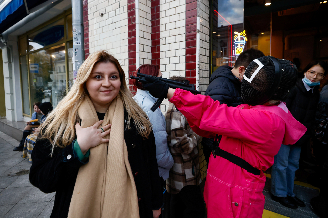 넷플릭스 3분기 가입자가 예상치보다 높은 438만명으로 발표되자 다수의 해외 언론들이 그 이유로 ‘오징어 게임’을 거론하고 있다. 사진은 러시아에서 한 시민이 ‘오징어 게임’ 이벤트에 참여하는 장면. [로이터] |