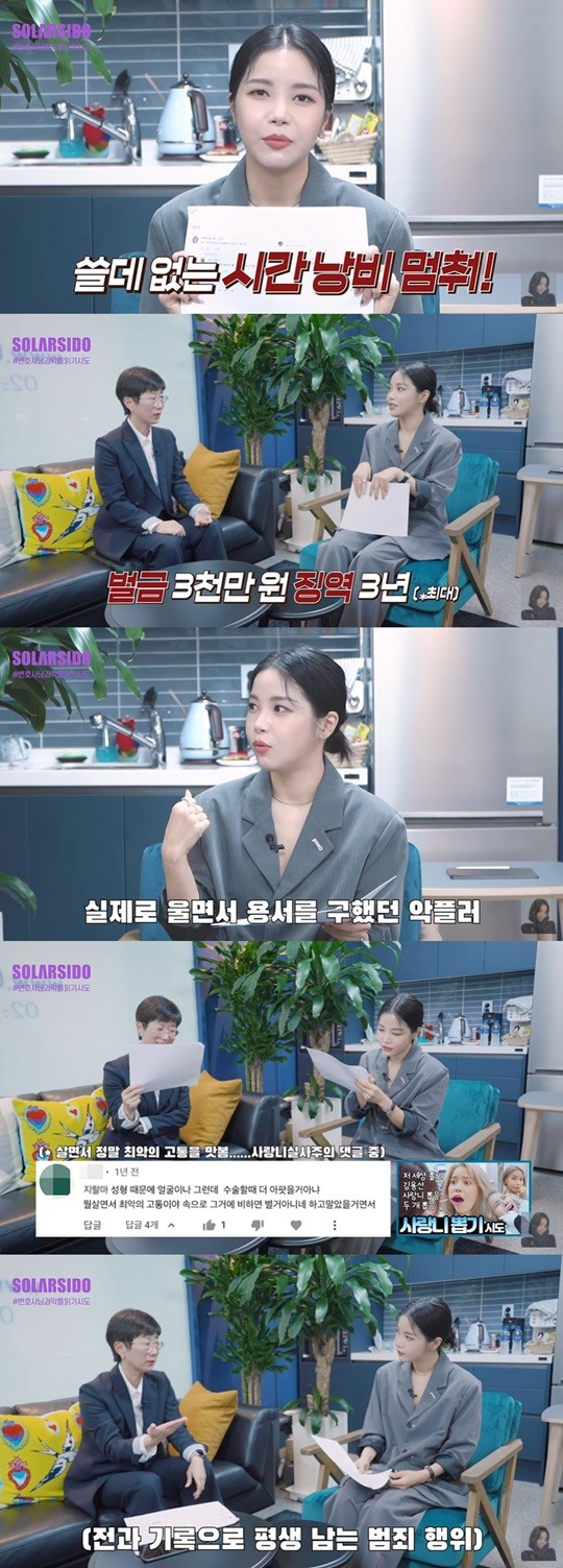 이날 솔라는 "오늘은 `악플 읽기 시도`를 한다"라며 변호사를 찾았다. 유튜버이기도 한 이지훈 변호사 사무실에 찾은 솔라는 "악플을 쓰는 악플러들에게 경각심을 주고 싶기도 하고 궁금하기도 해서 찾아왔다"라고 말했다.