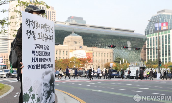 [서울=뉴스핌] 김민지 인턴기자 = 박정희 전 대통령의 서거 42주기인 26일 오후 서울광장에 마련된 박정희 전 대통령 추모 분향소에 한 시민이 손피켓을 들고 있다. 2021.10.26 kimkim@newspim.com