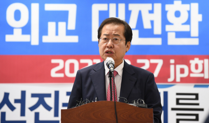 국민의힘 대선 경선 후보인 홍준표 의원이 27일 외교 분야 공약을 발표했다. 도널드 트럼프 전 미국 대통령의 미국 우선주의(America First)를 본뜬 ‘국익우선주의(Korea First)’를 외교 기조로 내세웠다. 한·미·일동맹을 강화하고 중국을 견제하는 데 무게가 실렸다.