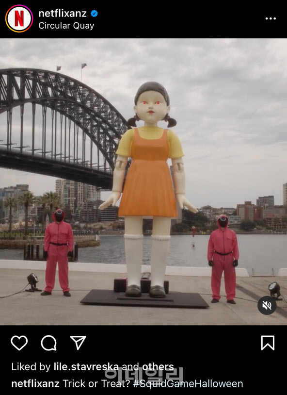 호주 시드니에서 넷플릭스 시리즈 ‘오징어 게임’에 등장한 영희 동상이 전시돼 눈길을 끈다. (사진=호주 넷플릭스 인스타그램) |