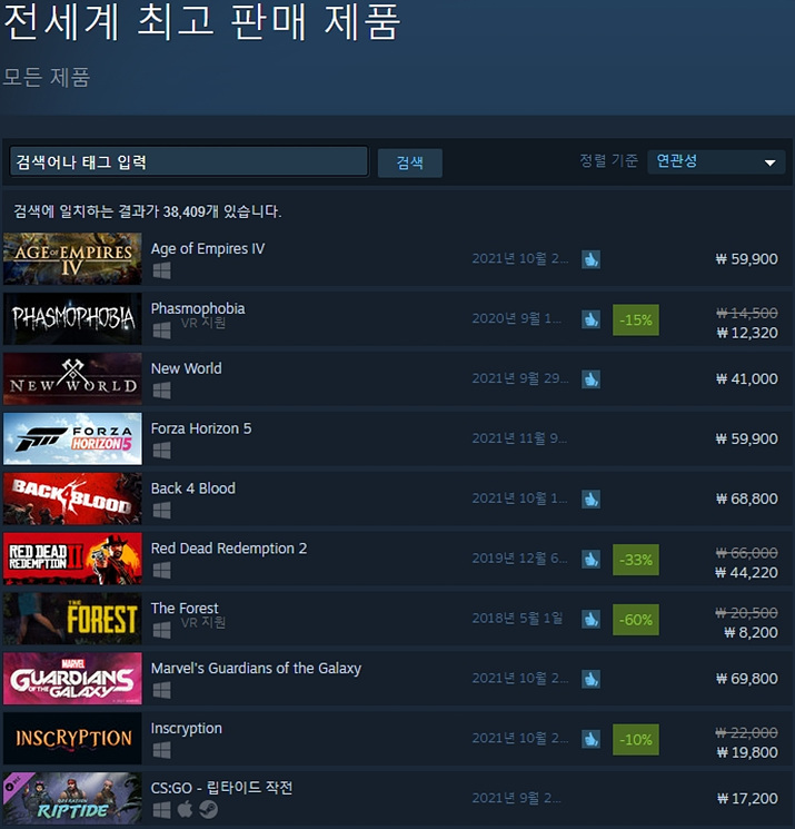 한편, 에이지 오브 엠파이어 4는 꾸준히 1위를 유지하고 있으며, 가디언즈 오브 갤럭시는 5위에서 7위까지 순위가 내려왔다. 최근 할인 판매를 시작한 레드 데드 리뎀션 2는 6위를 기록했다.