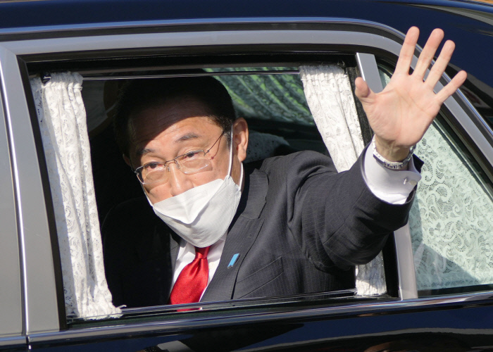 일본 중의원 선거 투·개표일을 하루 앞둔 지난달 30일 오후 자민당 총재인 기시다 후미오 총리가 도쿄도 조후시에서 거리유세를 마치고 떠나면서 손들어 지지자들에게 인사하고 있다. 연합뉴스 |