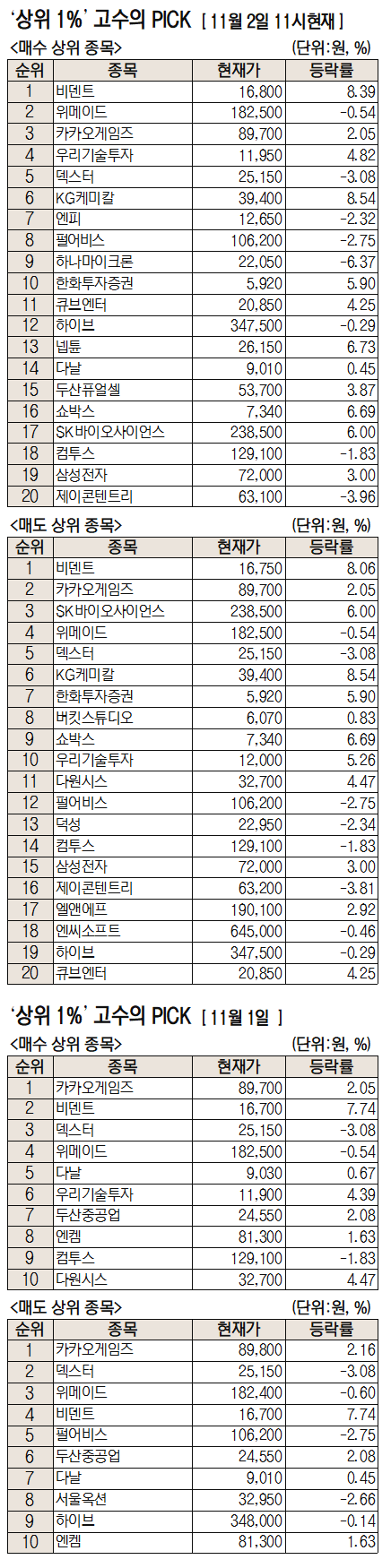 이날 ‘주식 초고수’들이 가장 적극적으로 내다 판 종목은 비덴트였다. 이외 카카오게임즈, SK바이오사이언스(302440), 위메이드, 덱스터 등도 매도 상위권에 이름을 올렸다.