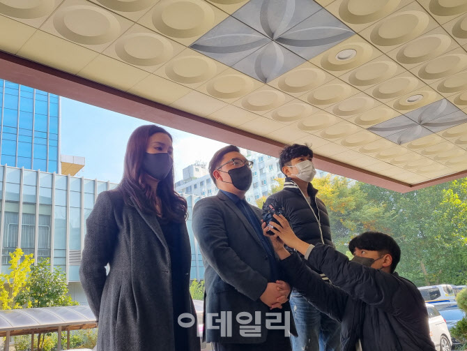 2일 오후 1시 51분쯤 서울 영등포경찰서에 출석한 김기홍 전국자영업자비상대책위원회(비대위) 공동대표가 경찰 조사에 앞서 기자회견을 갖고 있다. (왼쪽부터) 조지현 비대위 공동대표, 김기홍 비대위 공동대표, 이창호 공동대표.(사진=조민정 기자) |