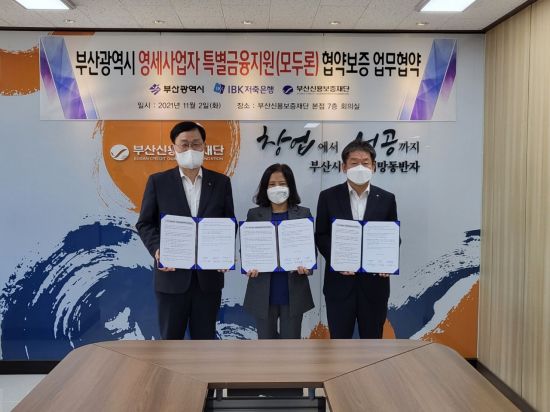2일 IBK저축은행은 부산광역시·부산신용보증재단과 ‘부산 영세자영업자 특별금융지원(모두론) 업무협약’을 체결했다. 협약은 코로나19로 어려움을 겪는 부산 영세사업자 자금지원을 위해 마련됐다. 협약식에는 김승모 부산신용보증재단 이사장, 김유진 부산시 경제일자리과장, 서정학 IBK저축은행 대표 등 총 3명이 참석했다.