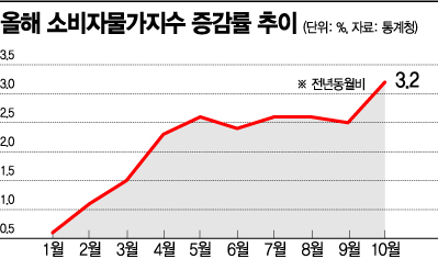지난 4월 이후 2%대였던 소비자물가지수 상승폭이 급격히 커진 것은 일단 기저효과 요인이 컸다. 지난해 10월 정부는 16~34세 및 65세 이상 국민에게 1인당 2만원의 통신비를 지원하면서 물가상승률(0.1%)을 낮춘바 있다. 통신비 지원이 종료되면서 오름폭이 크게 나타난 것이다. 지난달 물가인상률에는 약 0.7%포인트의 영향을 미친 것으로 분석됐다.