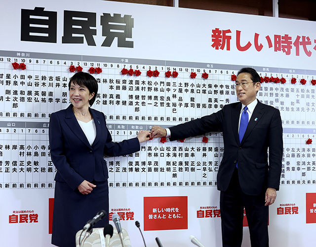 ▲ 지난 10월 31일 치러진 일본 중의원 선거에서 여당인 자민당이 단독 과반을 달성했다. 기시다 후미오(오른쪽) 일본 총리가 자민당사에서 당선자와 함께 당선자 이름 위에 장미꽃을 붙이고 있다. ⓒ로이터=연합뉴스 |
