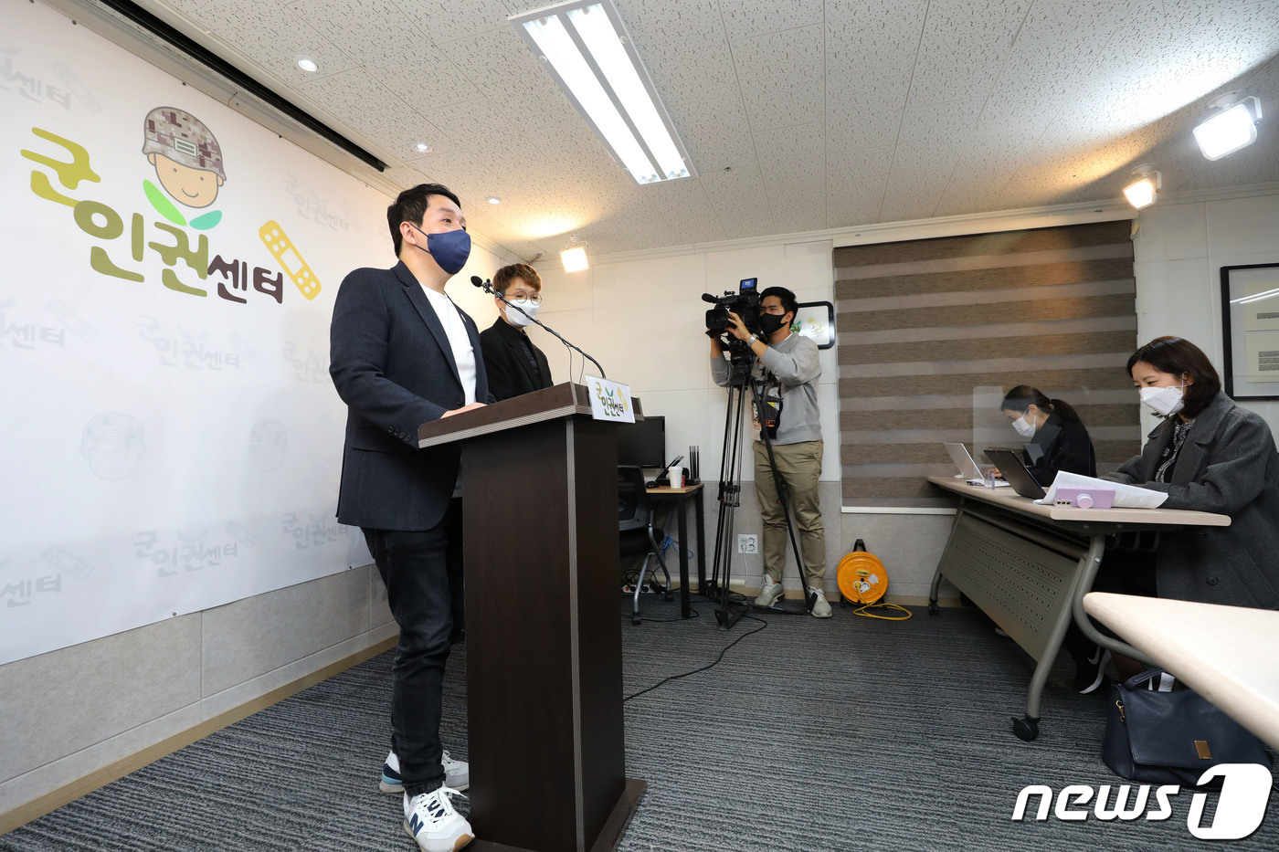 (서울=뉴스1) 이광호 기자 = 임태훈 군인권센터장이 15일 오전 서울 마포구 군인권센터에서 '공군, 성추행 피해 여군 사망 사건' 관련 기자회견을 하고 있다. 임 센터장은 기자회견에서 공군 8전투비행단에서 발생한 성추행 피해 여군 부사관 사망 사건을 공군이 스트레스 자살로 둔갑시키며 엉망진창으로 사건을 처리했다고 주장했다. 2021.11.15/뉴스1
