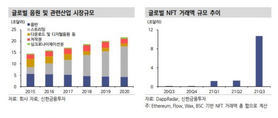 정민구 신한금투 연구원은 "뮤직 메타버스에서는 음악 작업에서부터 뮤지션 발굴 및 콘서트까지 음악산업 내 다양한 서비스들이 구현될 전망"이라며 "토큰이코노미의 성격에 따라 생태계 내 유저들 사이에서 일어나는 모든 경제활동에 대한 수수료 발생이 예상되며, 플랫폼 출시 후 생태계 내 이용자 유입에 따른 경제규모 증가와 수수료 매출 또한 빠르게 증가할 전망"이라고 내다봤다.