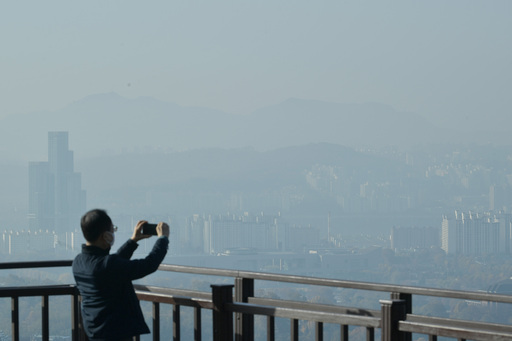 중국발 미세먼지 영향으로 경기 등 지역에 초미세먼지가 ‘나쁨’ 수준을 보인 16일 서울 남산을 찾은 한 시민이 뿌옇게 보이는 서울 도심을 스마트폰에 담고 있다. 환경부는 이날 전국 17개 시도 및 관계 부처와 미세먼지 재난대응 안전한국훈련을 시행했다.