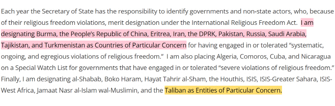 국무장관은 1998년 미 의회가 제정한 국제종교자유법에 따라 특별우려국과 특별감시국 등을 지정하고 있다.