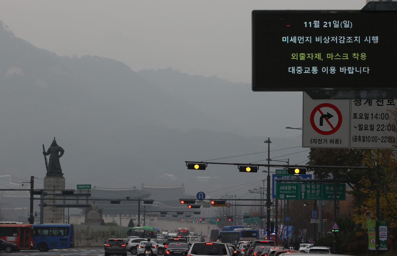 서울 지역에 미세먼지 비상저감조치가 발령된 지난 21일 오후 서울 종로구 광화문광장 인근 전광판에 시행 안내문이 표출되고 있다. [연합] |