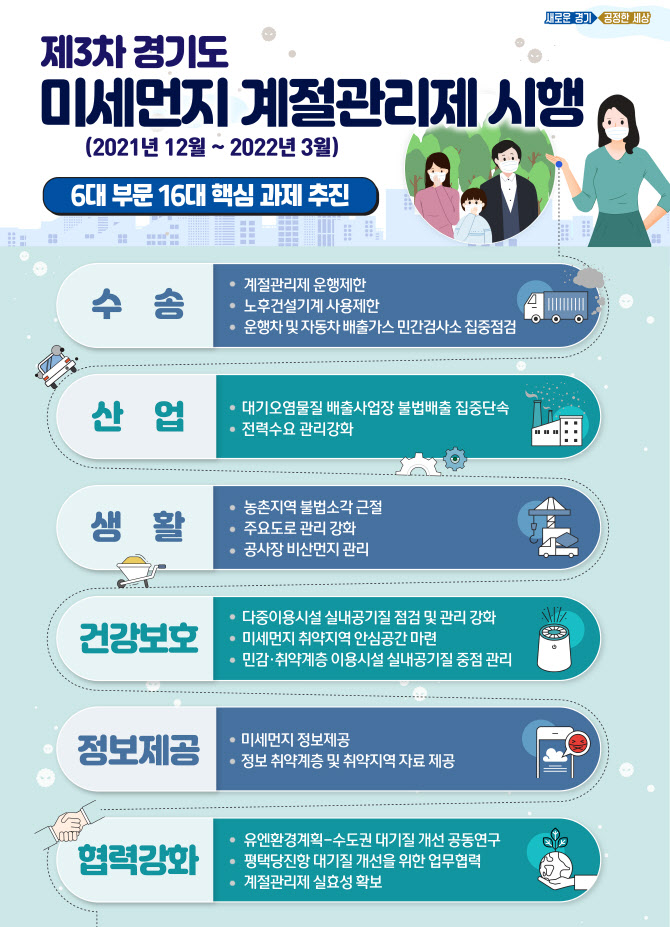 도는 3차 계절관리기간을 맞아 △수송 △산업 △생활 △건강보호 △정보제공 △업무협력 등 6대 부문에서 16개 이행과제를 선정해 추진할 계획이다.