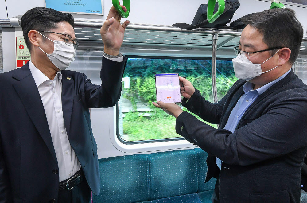 서울 성동구 지하철 2호선 지선 신설동행 열차를 탑승한 조경식 과학기술정보통신부 차관(왼쪽)이 5G 28㎓ 성능 속도에 대한 설명을 듣고 있다. |