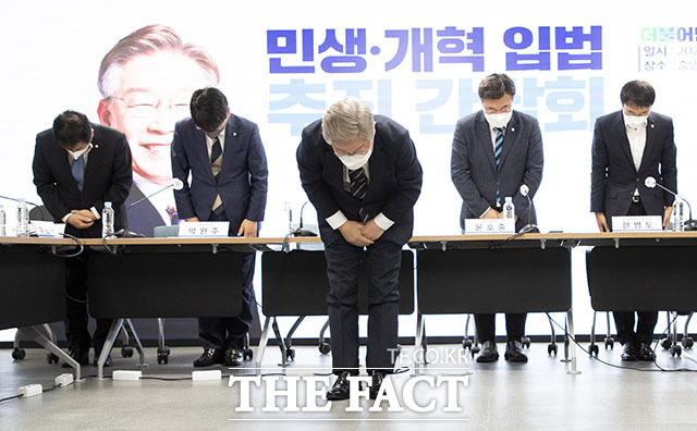 24일 여의도 더불어민주당 중앙당사에서 열린 민생·개혁 입법 추진 간담회에서 이재명 제21대 대통령후보가 ‘새로운 민주당으로 거듭나겠다’고 말하며 국민들에게 고개숙여 인사하고 있다. /남윤호 기자 |