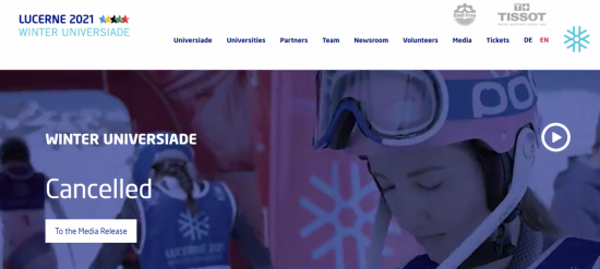 2021 스위스 동계 유니버시아드 대회 홈페이지가 행사 취소를 알리고 있다. |