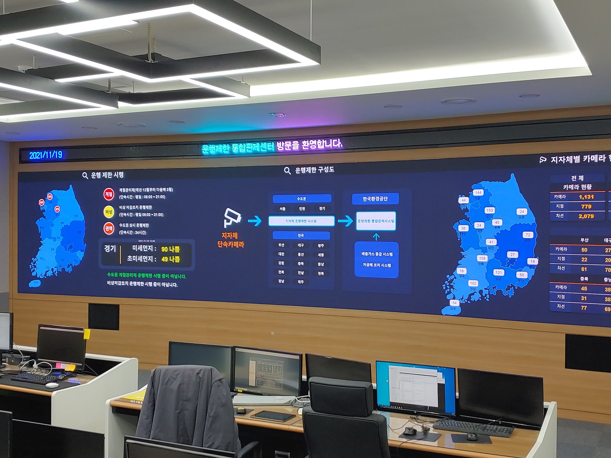 지난 19일 오후 인천의 한국환경공단 기후대기관. 미세먼지 수준 '나쁨'인 이날, 운행제한 통합관제센터 앞의 대형 LED 화면이 빠르게 바뀌었다. 전국 지자체, 정부 부처 시스템과 연계된 배출가스 5등급 차량 통계 수치가 실시간 업데이트됐다.