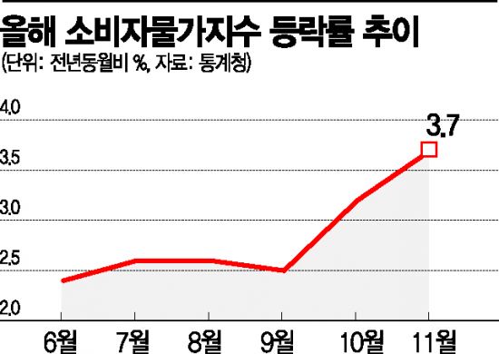 2일 통계청이 발표한 ‘11월 소비자물가동향’에 따르면 지난달 소비자물가지수는 109.41(2015년=100 기준)로 지난해 같은 달보다 3.7% 상승했다. 2011년 12월(4.2%) 이후 9년11개월 만에 가장 큰 폭의 오름세다. 지난 10월(3.2%)에 이어 두 달 연속 3%대 물가상승률을 기록한 것도 2012년 1월과 2월 이후 처음이다.
