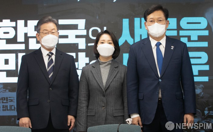 [서울=뉴스핌] 이형석 기자 = 이재명 더불어민주당 대선후보(왼쪽)가 지난달 30일 오전 서울 여의도 당사에서 공동상임위원장으로 임명된 조동연 교수(가운데)와 기념촬영을 하고 있다. 2021.11.30 leehs@newspim.com |