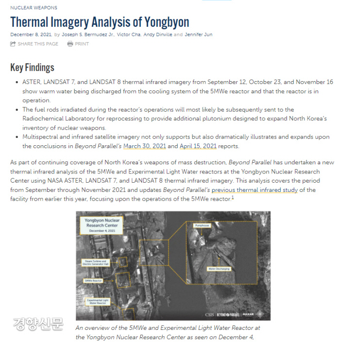 미국 싱크탱크 전략국제문제연구소(CSIS)의 북한 전문 사이트 ‘분단을 넘어’는 8일(현지시간) 영변 핵단지의 5메가와트(㎿) 원자로의 냉각 시스템에서 온수가 방류되고 있는 것으로 나타났다면서 이는 원자로가 가동 중임을 보여준다고 밝혔다. 상업용 인공위성이 지난 9월 12일, 10월 23일, 11월 16일 촬영환 열적외선 사진을 통해 원자로에서 온수가 방류되는 명확한 증거가 포착됐다는 것이다.