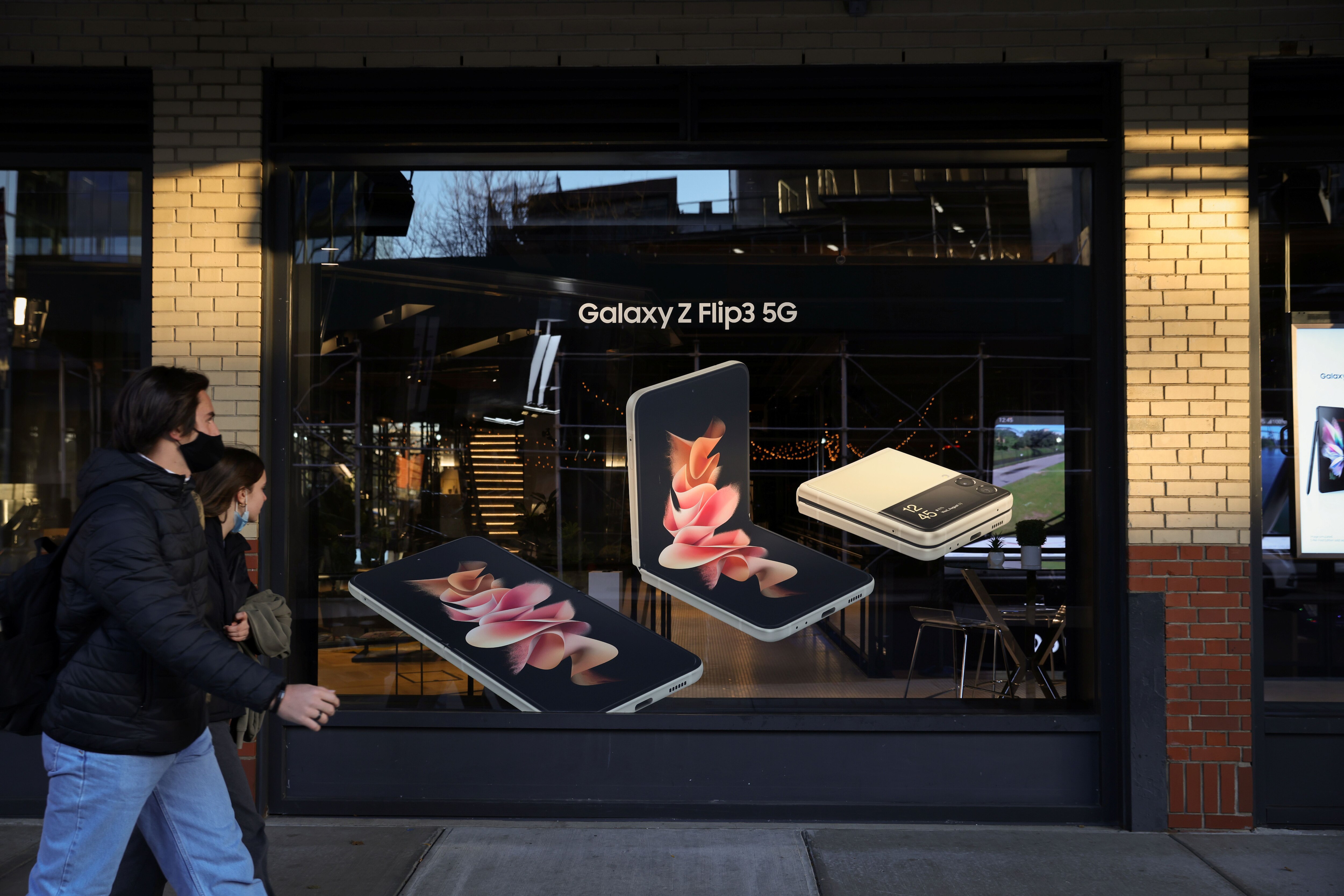 사진은 미국 뉴욕에 있는 삼성전자의 5G 스마트폰 '갤럭시Z플립3' 광고 현수막을 행인이 지나가고 있는 모습. /로이터 연합뉴스 |