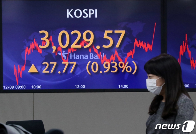 (서울=뉴스1) 박세연 기자 = 9일 오후 서울 중구 하나은행 딜링룸 전광판에 코스피 지수가 전 거래일보다 27.77 포인트(0.93%) 상승한 3,029.57을 나타내고 있다. 이날 코스닥 지수는 전일 대비 16.83포인트(1.67%) 오른 1,022.87로 원달러 환율은 1.4원 내린 1,174.5원으로 장을 마쳤다. 2021.12.9/뉴스1 |
