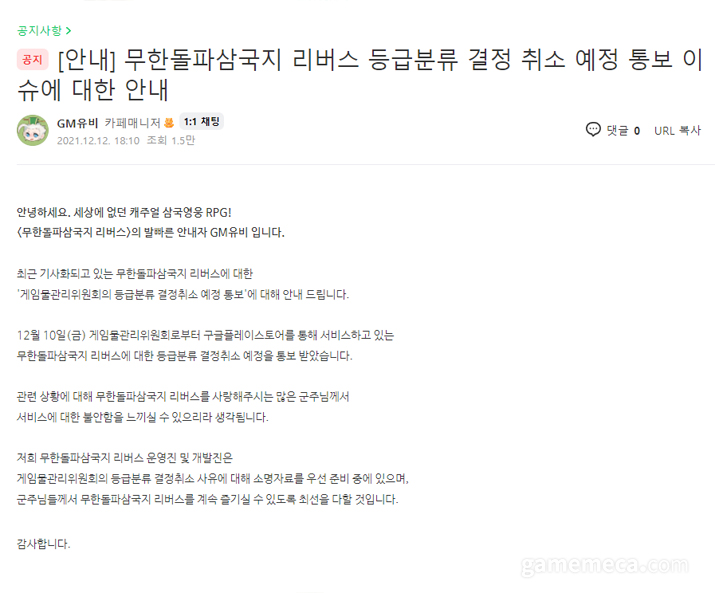 ▲ 게임위로부터 받은 등급분류 결정취소 예정 통보에 대한 공지 (자료출처: 무한돌파삼국지 리버스 공식 카페) |