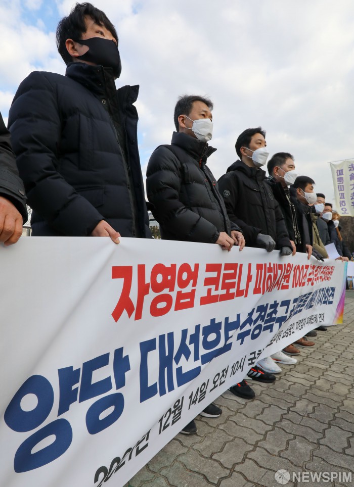 [서울=뉴스핌] 황준선 인턴기자 = 14일 오전 서울 여의도 국회 앞에서 코로나19 피해 소상공인 자영업자 피해단체 연대가 '자영업 코로나 피해지원 100조 추경 즉각 추진하라! 양당 대선후보 추경 촉구 공개 토론회 제안 기자회견'을 하고 있다. 2021.12.14 hwang@newspim.com