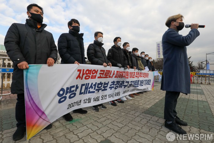 [서울=뉴스핌] 황준선 인턴기자 = 14일 오전 서울 여의도 국회 앞에서 코로나19 피해 소상공인 자영업자 피해단체 연대가 '자영업 코로나 피해지원 100조 추경 즉각 추진하라! 양당 대선후보 추경 촉구 공개 토론회 제안 기자회견'을 하고 있다. 2021.12.14 hwang@newspim.com