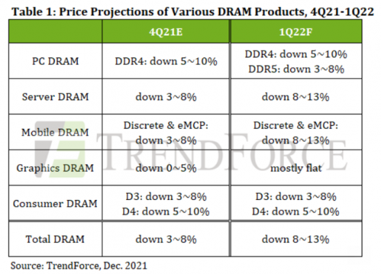 14일 대만 시장조사업체 트렌드포스는 올해 4분기 전체 D램 평균판매가격이 전분기대비 3~8% 하락하고, 내년 1분기에 8~13% 떨어질 것으로 예상했다. 트렌드포스는 "PC OEM(주문자상표부착생산)의 재고 수준이 수개월 새 줄어들었지만 그럼에도 내년 1분기 D램의 전체 수요는 하락 사이클에 진입하고 그에 따라 가격도 하방 궤도를 그릴 것으로 보인다"고 전망했다.
