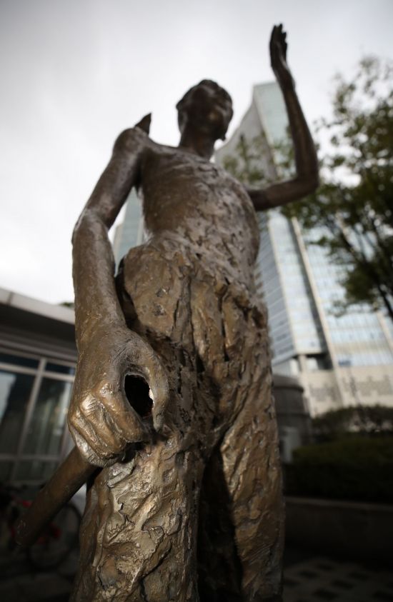 지난9월 29일 오후 서울 용산역 앞 광장에 있는 강제징용노동자상의 곡괭이 부분이 떼어져 훼손돼 있다. [이미지출처=연합뉴스] |