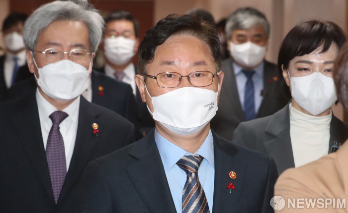 [서울=뉴스핌] 김학선 기자 = 박범계 법무부 장관(가운데) 등 국무위원들이 14일 서울 종로구 정부서울청사에서 열린 국무회의에 참석하고 있다. 2021.12.14 yooksa@newspim.com |
